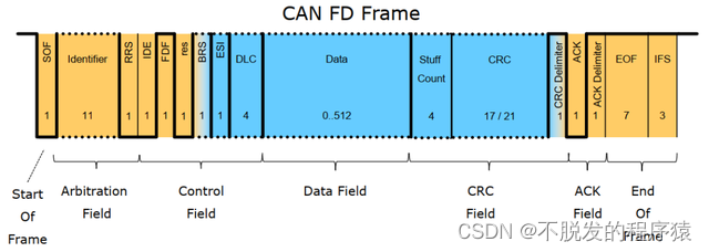与CAN一样,CAN FD一共具有:帧起始,仲裁段,控制段,数据段,CRC段,ACK段和帧结束,7部分组成。