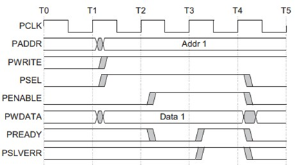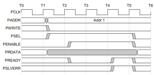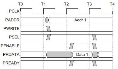 无等待状态从器件必须在读传输结束前提供数据。有等待状态在Access phase期间PREADY信号拉低,则传输被扩展。