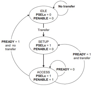 其特性包括:两个时钟周期传输;无需等待周期和回应信号;控制逻辑简单,只有四个控制信号。APB上的传输可以用简单的状态图来说明。