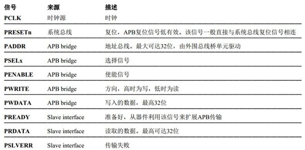 APB总线协议包含一个APB桥,它用来将AHB,ASB总线上的控制信号转化为APB从设备控制器上可用信号。APB总线上所有的外设都是从设备,这些从设备有以下特点: