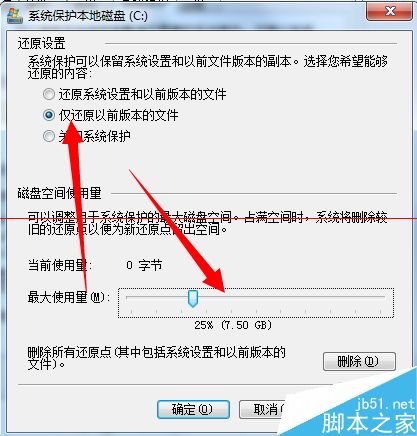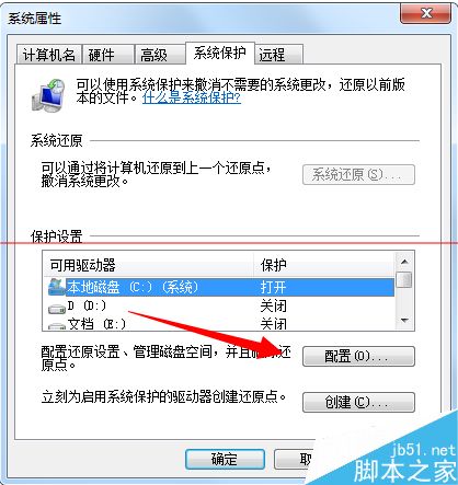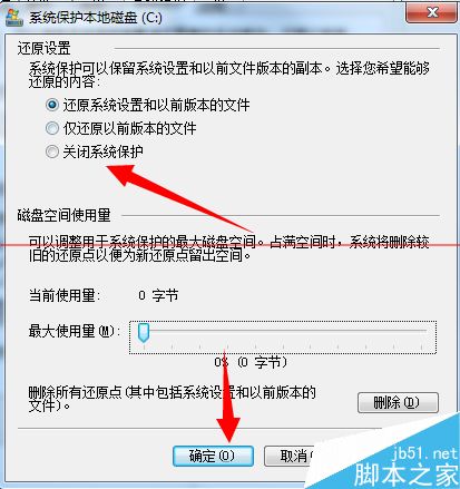 7、关闭系统还原,然后再次点击配置,将系统还原功能开启,将系统还原点空间设置的大一点。然后点击确定即可