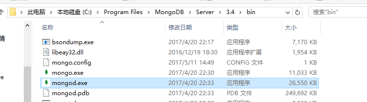 为了从命令提示符下运行MongoDB服务器,你必须从MongoDB目录的bin目录中执行mongod.exe文件,这是我的安装路径,在路径中找到mongod.exe文件。