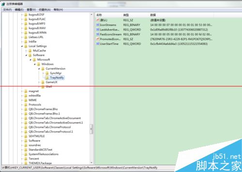 2、定位到以下路径:HKEY_CURRENT_USER\Software\Classes\Local Settings\Software\Microsoft\Windows\CurrentVersion\TrayNotify