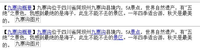 这种情况你不能直接将九寨沟替换为超链接啊,不然第一个链接就会被替换为链接中包含链接,然后是图片上的alt和title也替换了一个链接上去,这肯定是不符合HTML规范的。