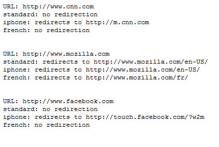 在第一个例子中,我们将提供一段用于侦测服务器是否有基于浏览器的重定向的代码。例如,有些网站会根据是否是手机浏览器甚至用户来自哪个国家来重定向网页。