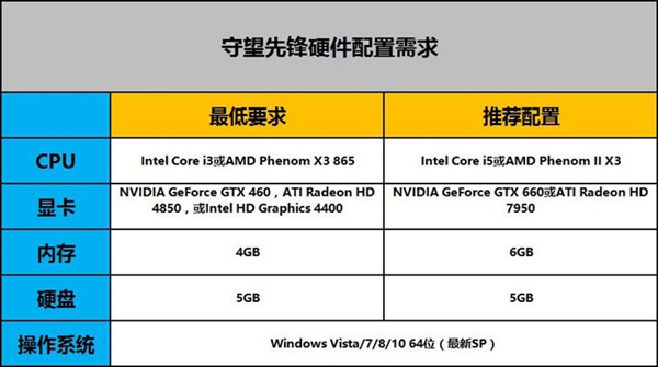 《守望先锋》PC版最低配置要求与推荐电脑配置清单表: