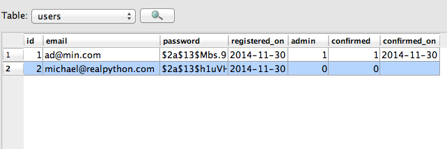 class User(db.Model): __tablename__ = "users" id = db.Column(db.Integer, primary_key=True) email = db.Column(db.String, unique=True, nullable=False) password = db.Column(db.String, nullable=False) registered_on = db.Column(db.DateTime, nullable=False) admin = db.Column(db.Boolean, nullable=False, default=False) confirmed = db.Column(db.Boolean, nullable=False, default=False) confirmed_on = db.Column(db.DateTime, nullable=True) def __init__(self, email, password, confirmed, paid=False, admin=False, confirmed_on=None): self.email = email self.password = bcrypt.generate_password_hash(password) self.registered_on = datetime.datetime.now() self.admin = admin self.confirmed = confirmed self.confirmed_on = confirmed_on