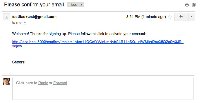打开应用,转入到 http://localhost:5000/register。然后用你能登陆的email地址注册。顺利的话,你应该会收到封email,看起来像这样: