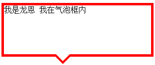 <div class="longen"> <span></span> <em></em> 我是龙恩 我在气泡框内</div> .longen {position:relative;width:300px;height:100px;border:5px solid red;} .longen span{position:absolute;left:100px;bottom:-40px;border-width:20px;border-style:solid dashed dashed; border-color:red transparent transparent;font-size:0; line-height:0;}.longen em{ position:absolute; bottom:-34px; left:100px;border-width:20px;border-style:solid dashed dashed; border-color:#FFF transparent transparent;font-size:0; line-height:0;} 下面我们再来看看第二种 不规则的效果该怎么实现呢?