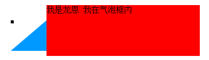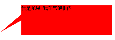 <div class="longen"> <div class="arrow"> <em></em> <span></span> </div> 我是龙恩 我在气泡框内</div>.longen {width:300px; height:100px;position:relative; background-color:red;margin:50px auto 0;}.arrow{ position:absolute; width:70px; height:60px; left:-70px; bottom:10px;}.arrow *{position:absolute; border-style:dashed solid solid dashed; font-size:0; line-height:0; }.arrow em{border-color:transparent #09F #09F transparent; border-width:30px 35px;} .arrow span{ border-width:20px 35px;border-color:transparent #FFF #FFF transparent; bottom:0;}二: 除了通过设置元素的border来模拟小三角之外,还可以用特殊字符来模拟,用特殊字符模拟小三角同样需要用到定位和重叠覆盖,只不过不需要调整border属性了。