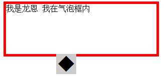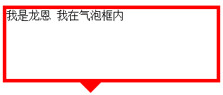 <div class="longen"> <div class="arrow"> <em>◆</em> <span>◆</span> </div> 我是龙恩 我在气泡框内</div> .longen{ width:300px; height:100px;position:relative; border:5px solid red; margin:50px auto 0;}.arrow{ position:absolute; width:40px; height:40px; left:100px; bottom:-40px;overflow:hidden;}.arrow *{position:absolute; font-size:40px; line-height:40px; width:40px; font-family:SimSun; font-style:normal; font-weight:normal; text-align:center; vertical-align:middle;}.arrow em{ color:red; top:-15px;}.arrow span{ color:#fff; top:-21px;}