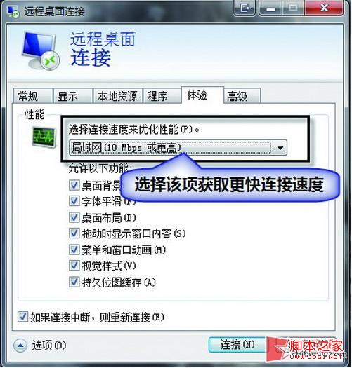 切换到“显示”选项可设置远程计算桌面的分辨率,在“本地资源”选项中可设置远程计算机的音频、键盘、打印机等属性,在“程序”选项中可设置连 接到远程计算机时,自动启动远程计算机中的某个程序,在“体验”中可设置连接速度,取消某些远程计算机的设置等,如果感觉连接速度慢,可取消远程计算机的 桌面背景等功能。