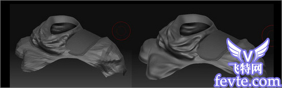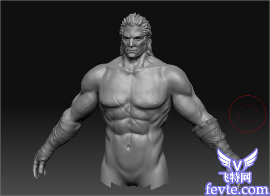 至于在ZB里如何去雕刻,个人有个人的习惯。我比较喜欢使用inflat来雕刻肌肉,因为他是膨胀型的的笔刷,可以让肌肉看起来更自然。其他的我会使用standard笔刷和pinch笔刷来配合使用,使用standard刷出大型,然后用pinch来令他更尖锐,强调一下边缘,令效果更好。如图