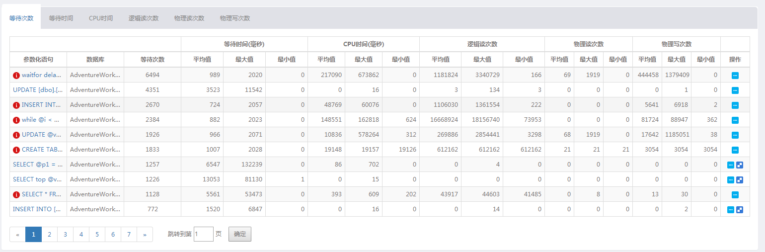 注:这里我们可以根据等待次数、等待时间、消耗的各种资源排序,来多维度分析阻塞的语句类型
