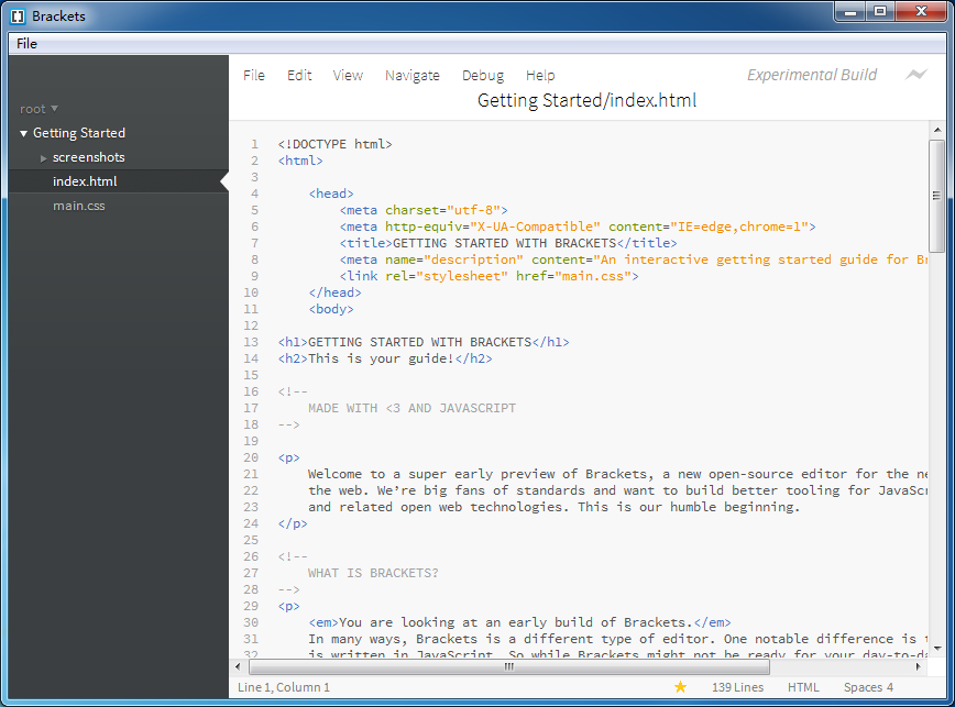 1、打开Brackets,整个界面很简洁,顶部菜单栏只提供file > exit退出编辑器功能。左侧为项目组织结构的文件树,使用Ctrl/Cmd+Shift+H可以呼出与关闭文件树。右侧为编辑区,上部为工具栏,中部为文档区域,下部为提示区域。