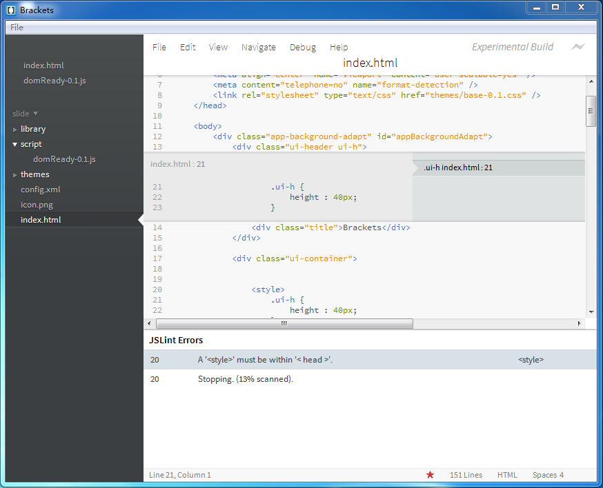 Brackets提供网页即时预览功能。使用该功能时,Brackets调用Chrome浏览器打开当前页面,此后修改html、css、javascript并保存后,所修改的内容会即时响应到浏览器中的页面,无须手动刷新页面。这是Brackets最大的一个亮点,有两个显示器的coder有福了,可以分屏显示Brackets和chrome,即时修改即时预览,无需切换编辑器/浏览器和刷新页面。