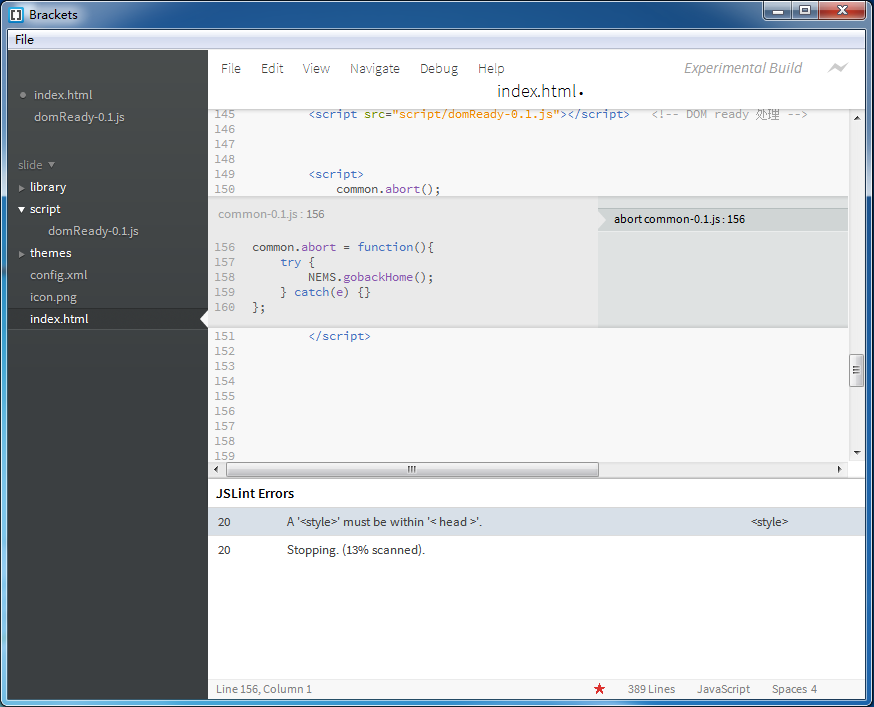 3、Brackets同样支持对JS对象定义的快速预览/编辑,把光标放在一个js函数名称上,按下Ctrl/Cmd + E(“编辑”)或退出编辑。