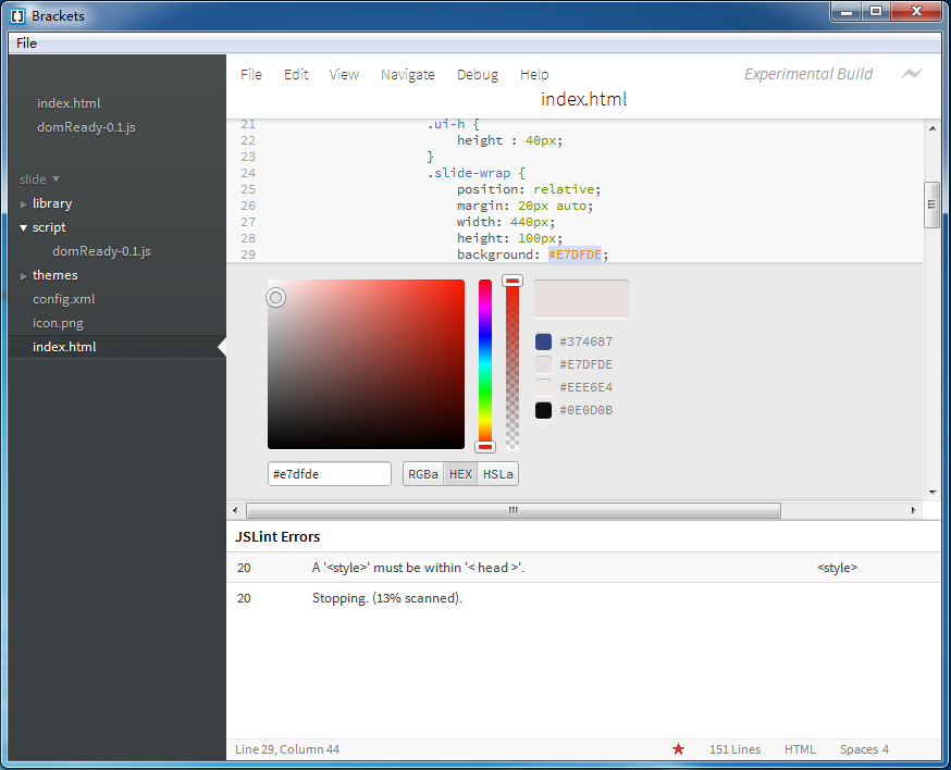 4、Brackets内建取色器,提供RGBa、HEX、HSLa的颜色编码形式。把光标放在一个颜色编码上,按下Ctrl/Cmd + E(“编辑”),退出取色器窗口需要使用Esc键。