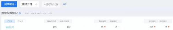 比如下图,我们可以明显看出“建材公司”这个关键词pc端明显要高于移动,所以我们在投放关键词时就可根据用户的的设备搜索比例来进行投放。