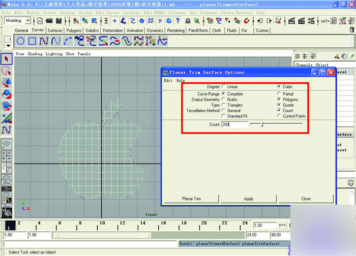 03第(2)选中标志的轮廓线,点击"Surfaces(表面成型)" →"Planar(平面成型)"后面的小方块标识,打开Planar的属性设置面板。将里面的Output Geometry设置成Polygons(多边形),将Type设置成Quads(四方块),将Tessellation Method设置为Count,并将下面的Count数值设为200,按下下面的Apply执行。这时刚才的轮廓线已经变成了一个平面了。现在,刚才绘制出来的轮廓线已经没有任何用处了。点击"Window(窗口)" →"Outliner(大纲窗口)",在大纲窗口中选中刚才绘制的EP曲线,将它们删除。