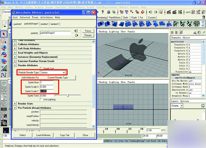 12这样,粒子效果就完成了。拉动一下时间轴,看粒子的运动是否满意。如果满意的话,将视图调节一个适当的位置就可以渲染了。点击"window(窗口)" →"rendering editors(渲染编辑)" →"render globals(渲染全局)",打开渲染全局窗口,设置file name prefix为lizi,frame/animation ext为name.#.ext,image format为targe(tga),设置end frame为500。在下面的resolution卷轴栏中,设置width和height分别为720和576。在视图中选择到苹果的标志,按下ctrl+h将它隐藏。按下f5,进入rendering(渲染)模块,点击"render(渲染)" →"batch render",然后渲染就开始了,这个时候就可以把maya关掉了。
