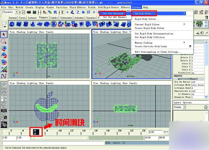 08第(7) 拨动下面的时间滑块,使粒子动画显示出来。选中那些矩形粒子,点击"solvers" →"initial state" →"set for selecet(设置被选择的)",将这些粒子独立出来。点击"window(窗口)" →"outliner(大纲窗口)",在大纲窗口中选中pplane1和bend1handle,将他们删除。