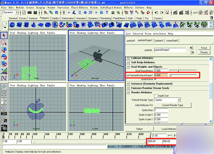 10把时间滑块旁边的显示祯数与结束祯数都设置为500。选中粒子,按下ctrl+a,打开它的属性设置面板,并展开它的goal weights and objects卷轴栏。将时间滑块拨动到第一祯,将polysurfacesshape1设置为0,并按下"s"键设置一个关键祯。将时间滑块拨动到最后一祯,将polysurfacesshape1设置为8,并按下"s"键设置一个关键祯。关键祯会在时间轴上以一条小红线来标示。