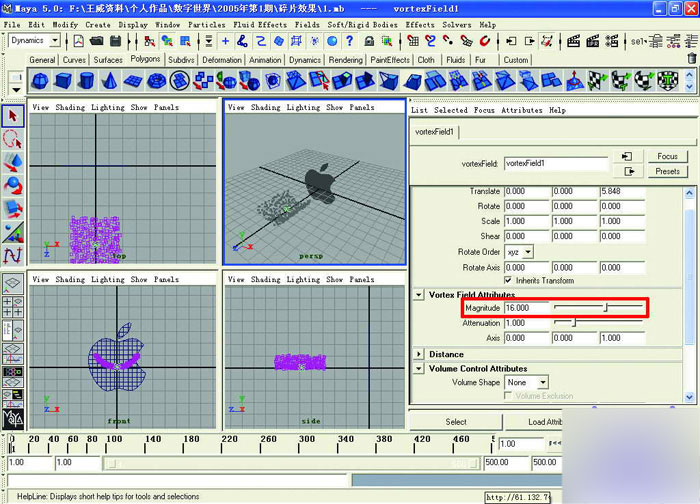 11选中粒子,点击"fields(场)" →"vortex(旋涡场)" ,按下ctrl+a,打开旋涡场的属性设置面板,在vortex field attributes(漩涡场属性)卷轴栏下,设置它的magnitude值为16。
