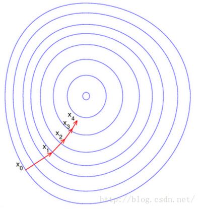 这里每一个圈代表一个函数梯度,最中心表示函数极值点,每次迭代根据当前位置求得的梯度(用于确定搜索方向以及与步长共同决定前进速度)和步长找到一个新的位置,这样不断迭代最终到达目标函数局部最优点(如果目标函数是凸函数,则到达全局最优点)。