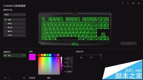 3、我们重点来看看如何自定义背光效果,如果要选中全键盘或是特定键位,只需在左侧点击相应的位置即可,我们主要的背光效果都在最下方调节。