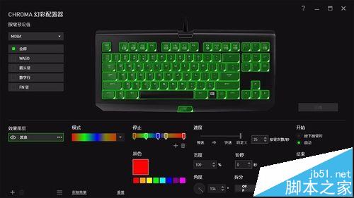 5、此种模式为涟漪效果,也是十分漂亮的一种模式,即按键按下之后,背光以按键为中心进行波纹式扩散,可以调节的选项也有很多。体来说,雷蛇的驱动程序想要调节出炫酷的背光效果十分简单,从没用过雷蛇驱动的玩家也可在很短的时间上手。