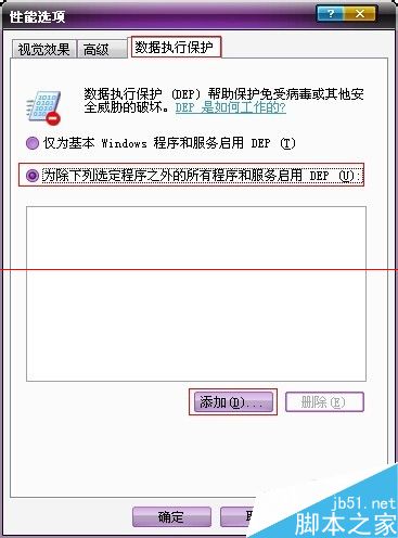 2、在【性能选项】界面中选择【数据执行保护】,然后选择【为除下列选定程序之外的所有程序和服务启用DEP(U)】,之后点击【添加】按钮。