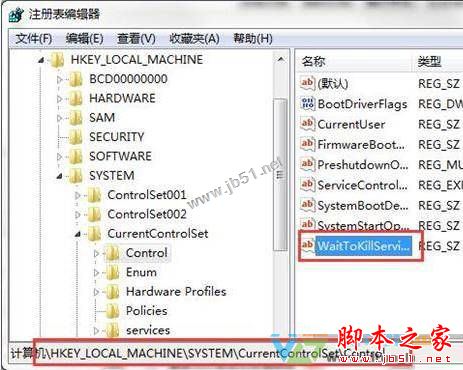 2、在注册表左侧依次展开:LOCAL_MACHINE\SYSTEM\CurrentControlSet\Control ,在右侧找到“waitToKillService”;
