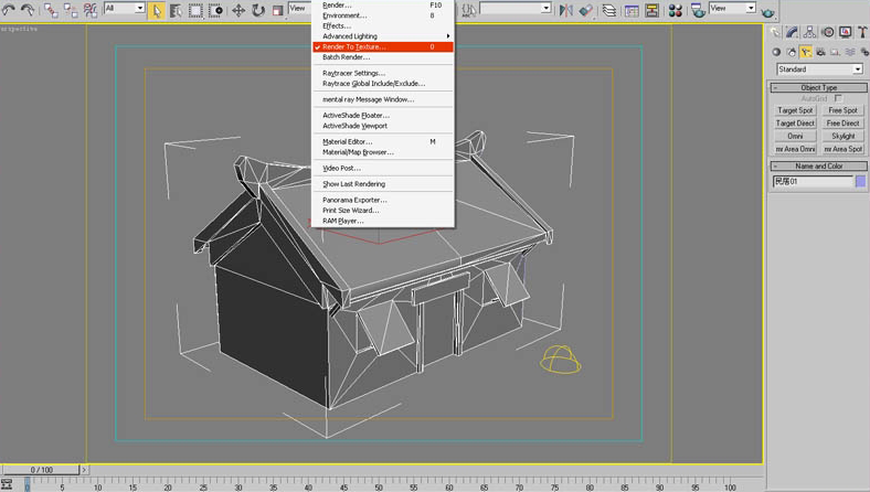 10、选择模型,点击Rendering(渲染)菜单下的Render To Texture(渲染到贴图)选项,也可直接按键盘上的快捷键数字0键。(图10)