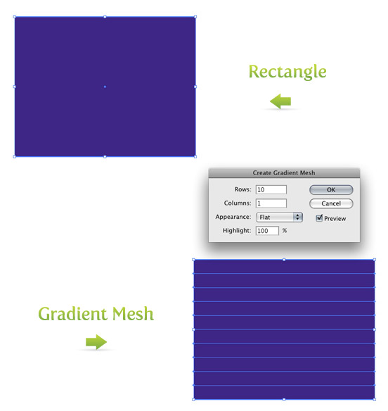 首先,使用矩形工具(M)画一个矩形。我上的是深紫罗兰色,当然你可以使用你喜欢的其他颜色。执行“对象”菜单>创建渐变网格,弹出渐变网格对话框。在对话框中,行数:10,列数:1,确定。现在矩形有10行,是被矩形的左边和右边的11个网格点分隔而成的。