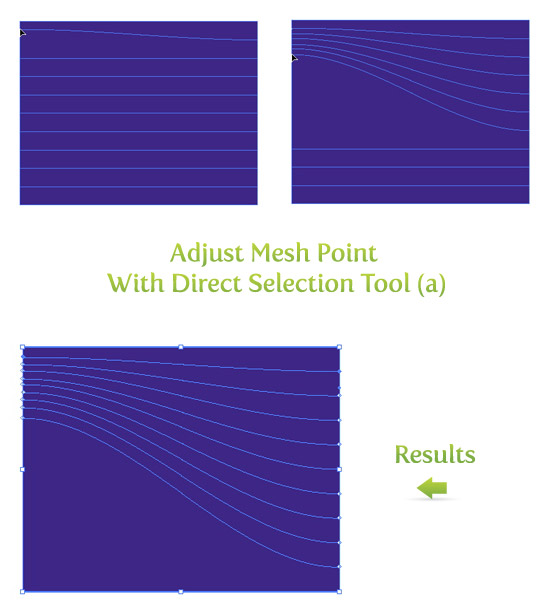 这是使用渐变网格最基础的实例。如果你想添加更多的网格点,使用渐变网格工具(U)。使用这个工具,你可以在任何设计作品中或者任何非复合对象中添加网格点。下面这个例子,我使用了渐变网格工具(U),在矩形的左边添加了网格点,更改了颜色,在其中一条线的中点添加了一个网格点,更改了颜色。
