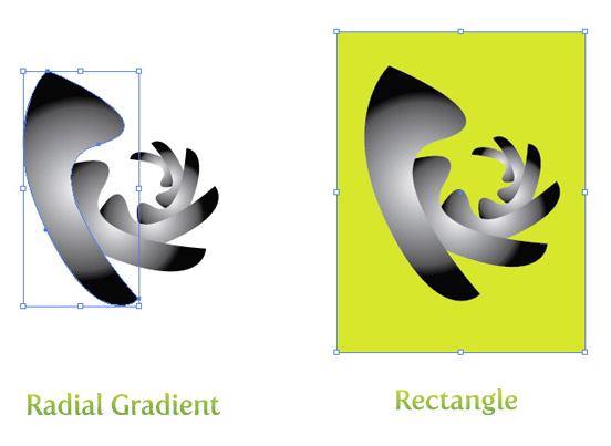 此时,形状仍然处于选中状态,从渐变面板里创建径向渐变。使用默认的黑白渐变色板,去掉描边。然后使用矩形工具(M)画一个矩形,包围变换形状,去掉描边,填上颜色,把矩形置于最底层(Ctrl+Shift+[)。