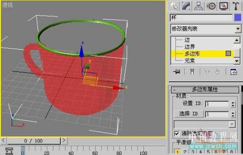 5.分析茶杯的材质:杯外表、内里、杯沿各不相同,又因为杯体是个整体,因此利用多边形的ID进行划分,同时给予多维—子物体材质就可以很容易的表达出来。另外,内外不同并不是单纯的由多维子物体材质表达(因为茶壶的原型是单面体),这个效果应该是由"双面材质"完成的。好了,思路出来了,请看我的过程,先来ID划分的: