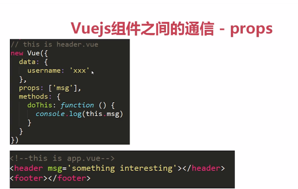 介绍一下Vue组件之间的通信,秉承了一个概念,必须先要注册,header.vue文件里面的代码,假设我们里面有个data是username,然后方法是dothis,我们看到有一个属性props,注册了一个msg,当我们的app.vue调用了header这个组件的时候,我们可以直接在header属性里面写msg,并且把app.vue里面任何的数据东西传到header.vue里面,所有的都由Vue的机制去实现,如果header.vue这里没有写msg的话,是获取不到属性的。