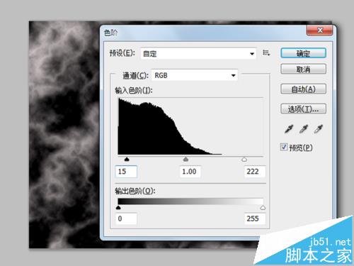 4、执行ctrl+l组合键调出色阶对话框,在弹出的对话框中设置数值为15、1、222,点击确定按钮。