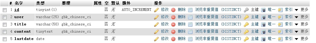 1.准备建立数据库表的结构,下面是我的表结构在phpMyAdmin下的截图: