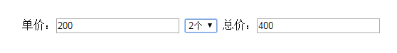 <body> <form name="myform" action="#" method="post" id="form1"> 单价:<input type="text" name="price" value="200"> <select name="count">数量 <option>1个</option> <option>2个</option> <option>3个</option> </select> 总价:<input type="text" name="total" value="200"> </form> </body>