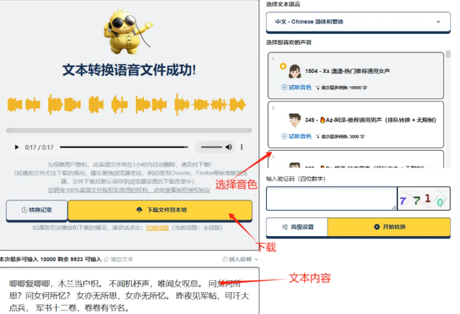 诗词视频不能光有画面,声音也要有韵味。这里推荐 TTSMAKER,这玩意儿能免费生成各种风格的AI配音。