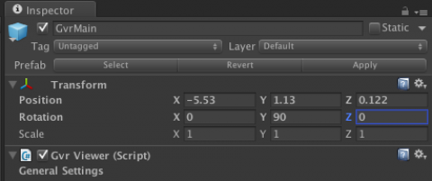 在GoogleVRPrefabs文件夹中,将GvrViewerMain预制体拖到Hierachy中。设置它的坐标几乎是你忍者角色的坐标(-5.53, 1.13, 0.122)