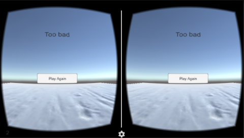 如果你现在运行你的游戏,你会看见合适的VR模式游戏结束界面。可以朝上看朝下看,看不同的部分,当你点击Play Again按钮时就会消失。
