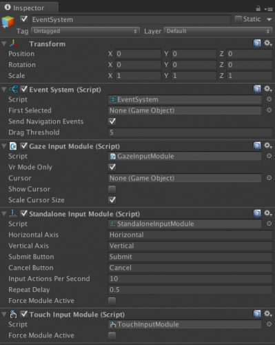 点击在Hierachy中的EventSystem 对象,添加GazeInputModule 脚本。这是一个让UGUI明白谷歌VR相机是怎么工作的。