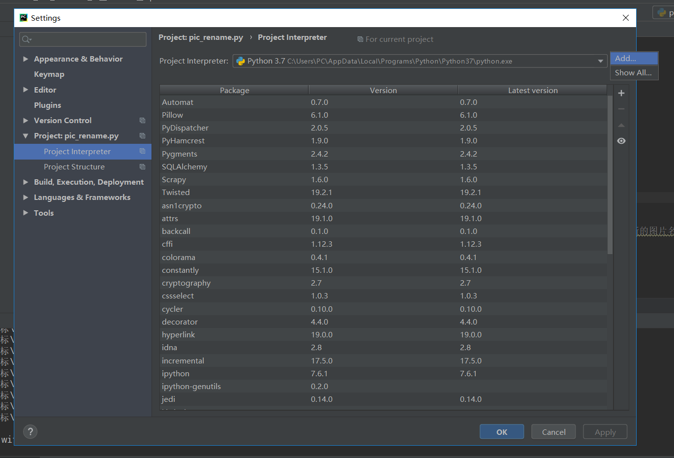 在这里,点击右边的设置按钮的add,将python.exe解释器添加进System.interpreter中,即可以解决上述问题。