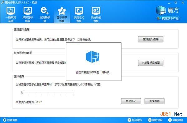 5、有时候,发现桌面图标,或者文件资源管理器中的图标缩略图出现错误,甚至不显示的时候,可以用修复大师里的图标缩略图修复功能进行修复,如下图所示,魔方在恢复资源管理器的图标缩略图。
