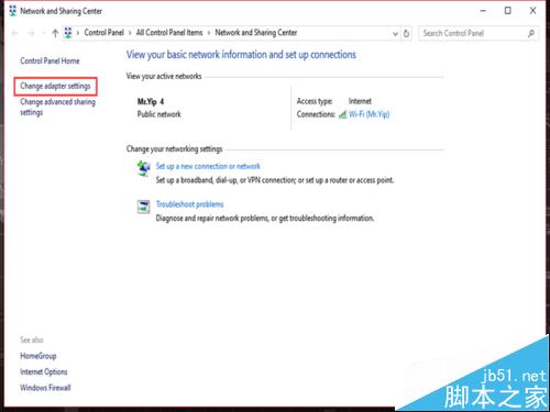 2、进入到网络共享中心窗口,选择左侧的”更改适配器“;