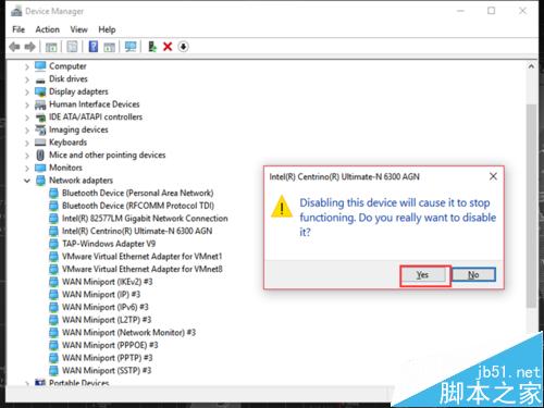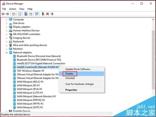在无线网卡上,右击选择“禁用”,在弹出的提示框中选择“是”;